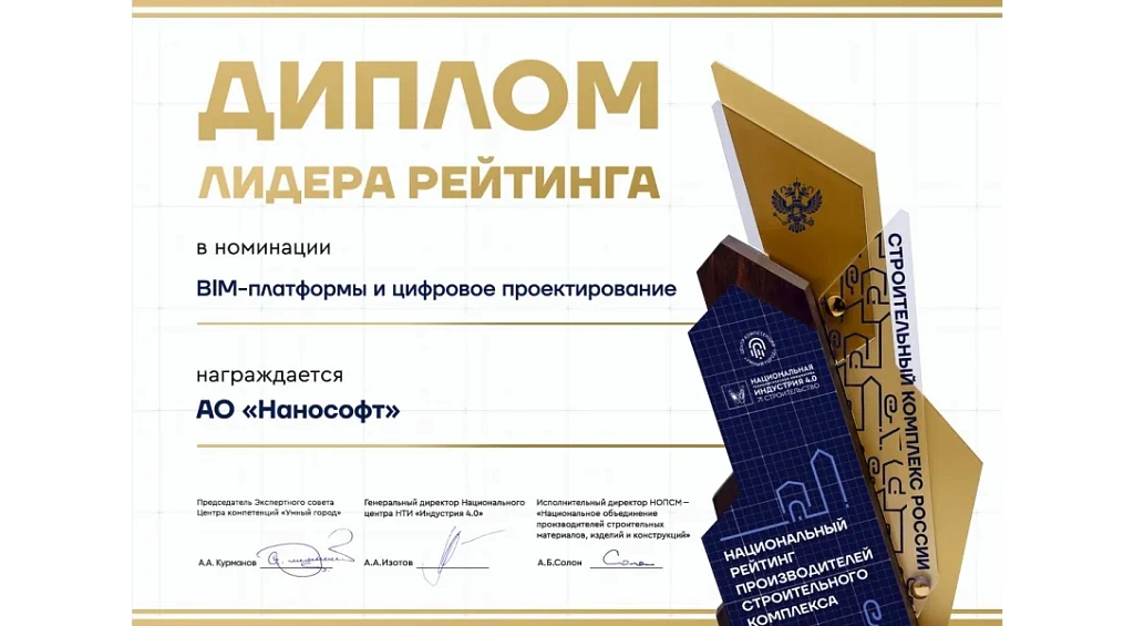 Москва, 14 апреля 2026 г. – Компания «Нанософт», ведущий российский разработчик САПР/ТИМ-решений, заняла первое место в Национальном рейтинге производителей строительного комплекса (номинация «BIM-платформы и цифровое проектирование») с линейкой продуктов nanoCAD BIM. Рейтинг определяется ежегодно Национальным центром НТИ «Индустрия 4.0» при поддержке Центра компетенций «Умный город».